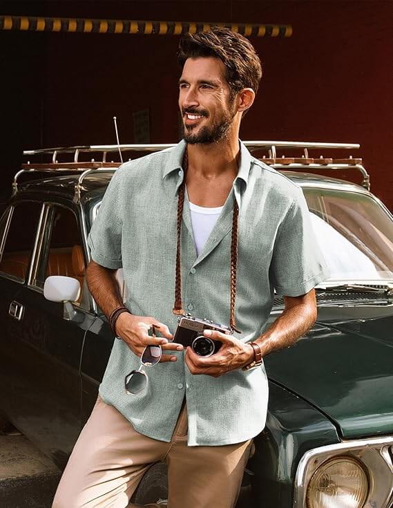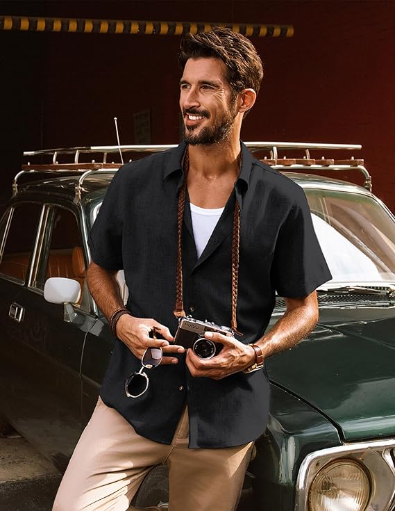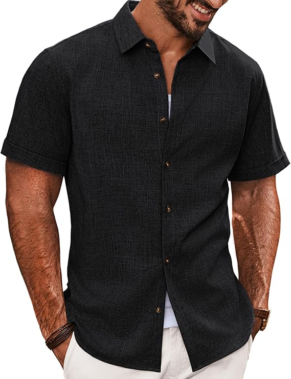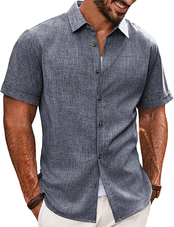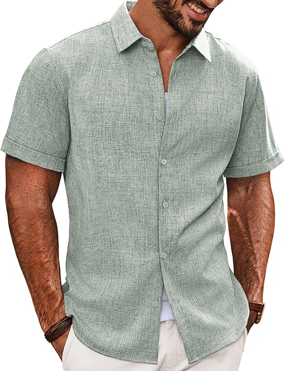 Men’s Button Down Short Sleeve Shirt Casual Cotton Summer Beach Linen Wedding Shirts with Pocket