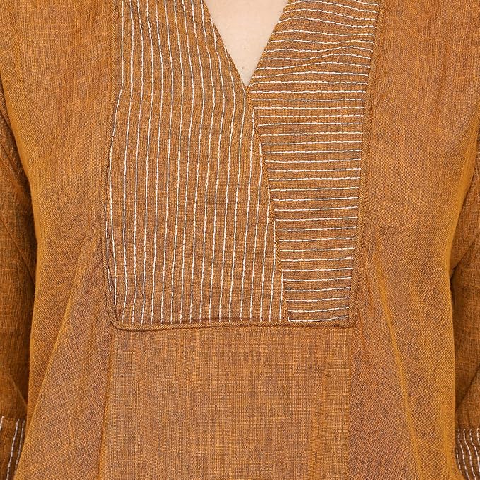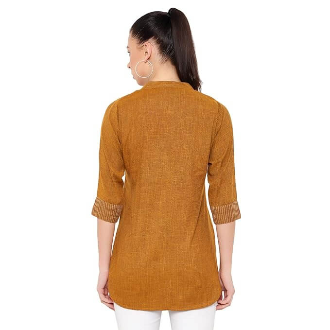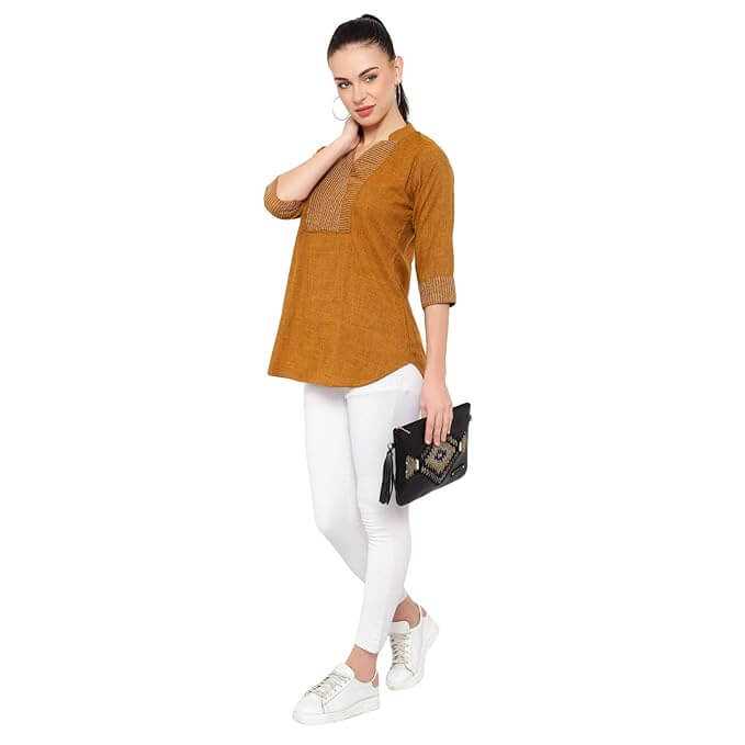 - Fabric : 100% Cotton Breathable Fabric, very soft and comfortable tunic top.; Style: Mustard solid cotton tunic top has embroidered V neck, 3/4th sleeves and curved hemline.